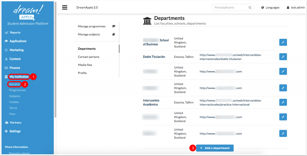 1-2. 学部の作成/編集 1, まずは学校情報を入力しよう。 2020.05.31 2020.05.20 1, まずは学校情報を入力しよう。 未分類 学部の新規作成は、左側メニューの①[My Institution]→②[General]sをクリックし、③[Add a department]をクリックします。 必須項目(学部名、国、都市名、ウェブサイト)を入力し、④[Save changes]をクリックし保存します。 編集の場合は、⑤スパナマークをクリックし⑥[Edit department]をクリックします。 必須項目(学部名、国、都市名、ウェブサイト)を変更し、④[Save changes]をクリックし保存します。